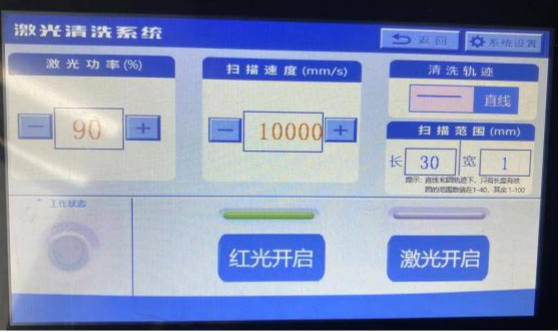 第5步:選好語言,調好參數;參數只需要調功率跟清洗模式就行了,一般功率用80~90。選清洗模式,清洗模式里的正弦模式的長寬不能超過:30×30; 圓形模式長寬不能超過:30×30;花瓣模式長寬不能超過:20×20;其他模式可以用1~80;調好之后點擊激光開啟。
