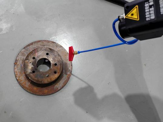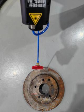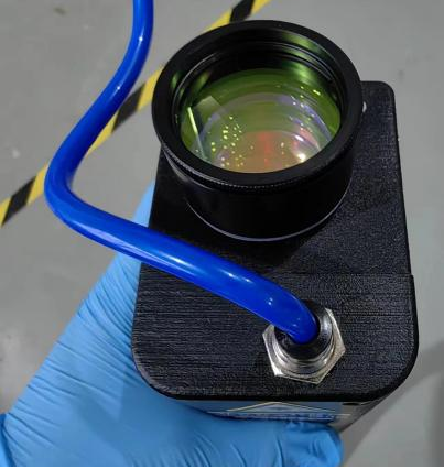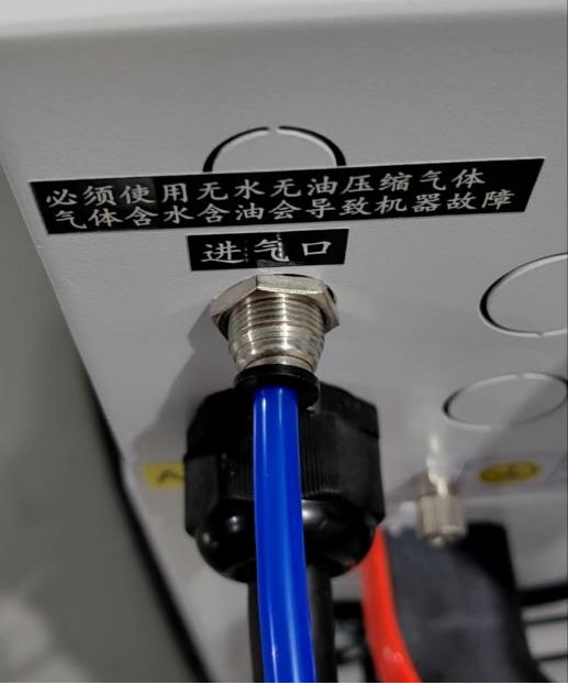 第6步:插入氣管接上壓縮氣體(接壓縮氣體吹氣是為了延長保護鏡片的壽命,防止除銹時粉塵粘在鏡片上,鏡片上粘了粉塵等污漬的話鏡片容易壞)